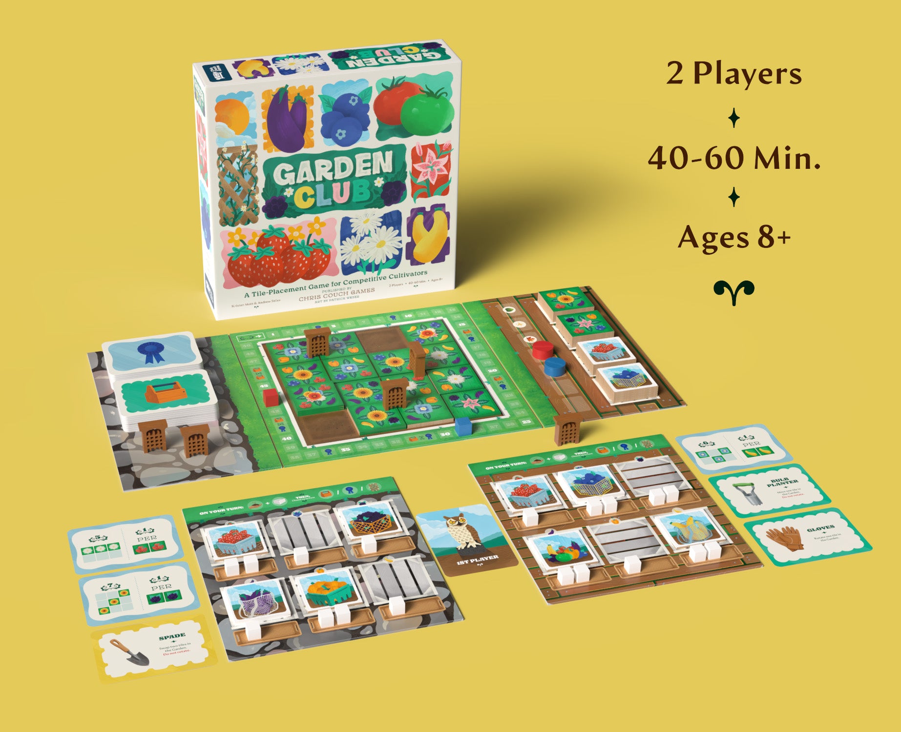 Garden Club is a tactical tile-placement game for competitive cultivators. Over three seasons, you’ll take simple turns filled with strategy as you grow a collective garden, accomplish projects, manipulate the garden with tools, and harvest produce for round-by-round engine building.