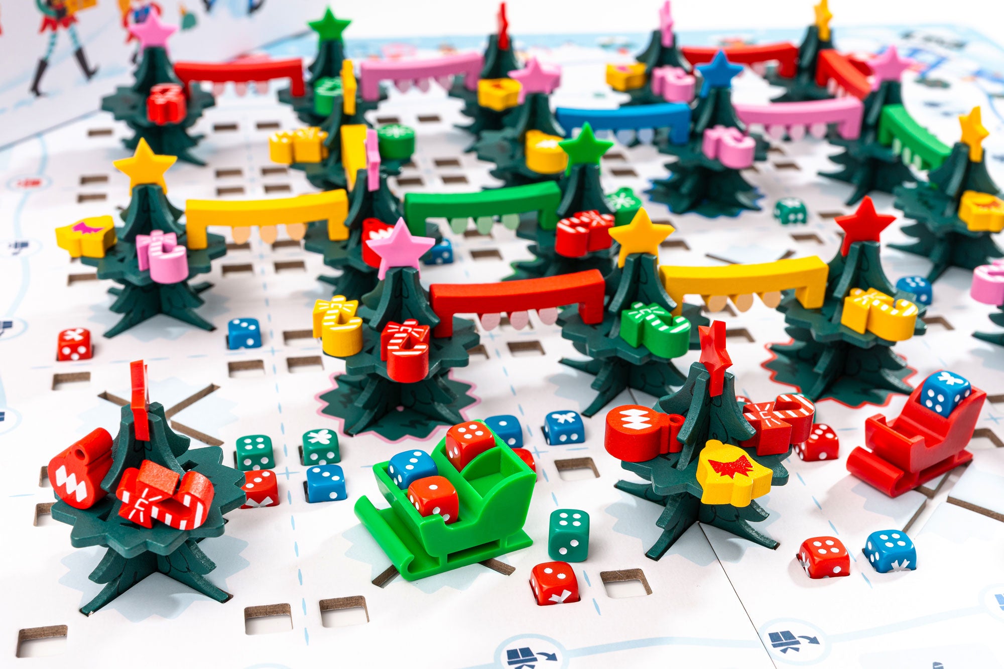 Unwrap something shiny and make your edition of Holiday Hills sparkle with 45 custom 10mm mini-dice! These dice replace the standard dice in the game, and the icons match the dice present icons on the game board and cards, aiding with accessibility. The "6" pip is now a bow icon.